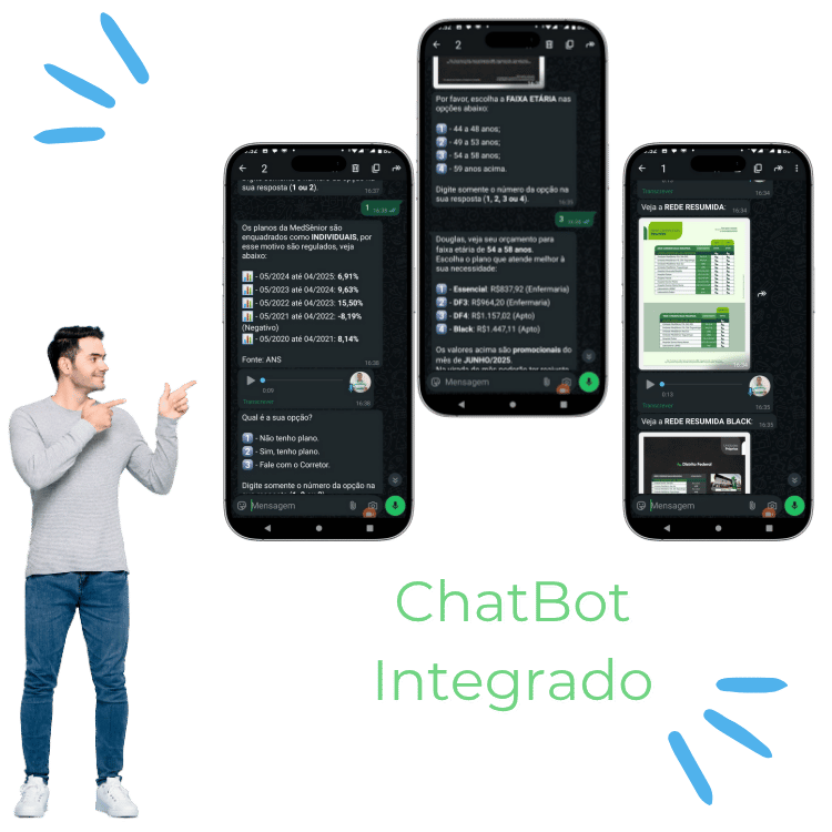 Diferente de bots genéricos, nosso ChatBot é feito sob medida para planos MedSênior: responde dúvidas frequentes, apresenta rede credenciada, mostra opções de planos e já coleta os dados do lead para envio de proposta.
